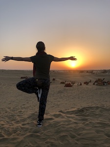 Punktem zwrotnym był wyjazd do Indii. Wcale nie jechałam tam z nastawieniem, że w ogóle pomyślę o jodze, a co dopiero będę ją praktykować. Wszystko odmieniło się, gdy dotarliśmy na pustynię Thar na zachód słońca. Z pozoru głupia zachcianka zrobienia pozycji drzewa do zdjęcia na tle zachodzącego słońca sprawiła, że coś w mojej głowie kliknęło. Coś się zadziało i wtedy mogłam to nazwać jedynie magicznym momentem. Jeszcze nie wiedziałam, co się z tego wszystkiego narodzi.